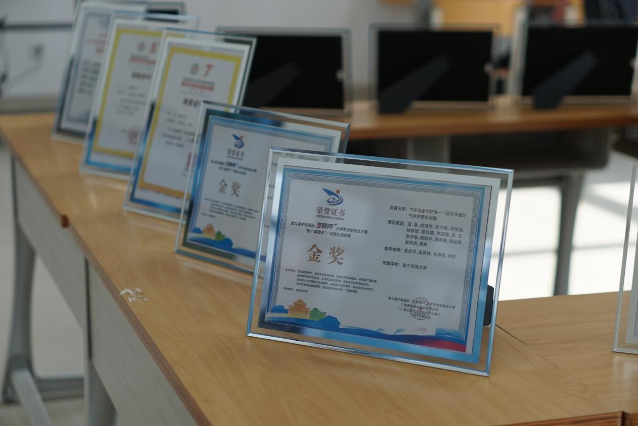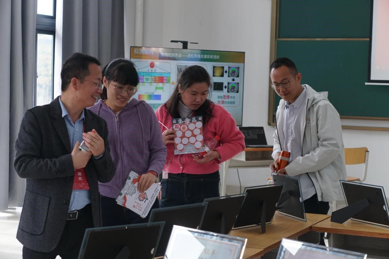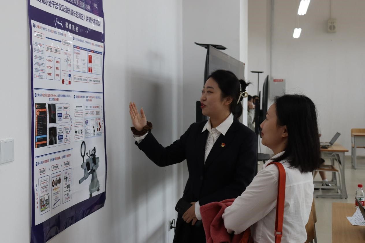过往写意,时光重合。展览厅里承载着历代物电学子的荣光,凝视那一张张肯定着物电人拼搏精神的获奖证书,大学生竞赛成果路演展示中,物电学院讲解员向校友展示了迈克尔逊干涉仪及激光波长测定、一键识甜-便携式水果成熟度预测仪等七项创新大赛项目内容,以及多类创新大赛奖项。其中,校友颇有兴致地探讨第九届全国大学生物理实验竞赛一等奖《用转动惯量仪测量刚体的转动惯量》。校友向讲解员提出问题,肯定其成果以及物电学院育人立院、科研强院的发展战略,并向我院优秀学子发出邀请。大学生竞赛成果路演展厅为物电学子提供了一个向校友展示和交流的平台,创造了就业机会,同时也鼓励在校学子不断奋斗,积极参与各类比赛。