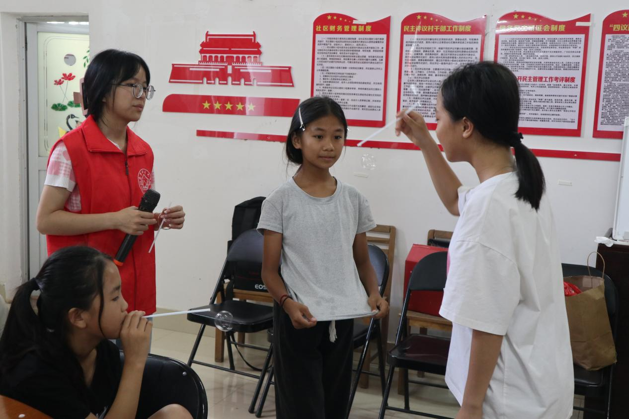 其次,“青春强国行”以物理学科魅力为引,寓教于乐,激发儿童物理兴趣与探索精神,培养创新思维与实践能力。实践团以一系列创意十足的趣味实验——“不破的泡泡”、“深海静电章鱼”及“掌上火焰”,让孩子们在动手操作中体验到科学的神奇与魅力。实验结束后,实践团详细地给孩子们解释实验原理,并将原理与日常生活相联系,拓宽了孩子们的科学视野。其中,“掌上火焰”实验成为防火安全教育的生动教材,孩子们在惊叹之余,也深刻认识到了防火的重要性。