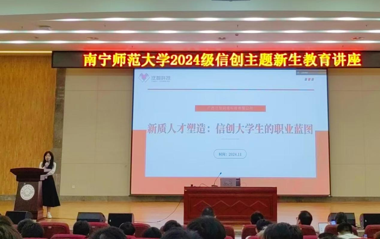 2024年11月12日下午,南宁师范大学bw必威西汉姆联携手广西泛智网络科技有限公司(以下简称“泛智科技”)在图书馆报告厅103成功举办题为“破解卡脖子问题构建发展新格局——自主CPU发展现状,以及新质人才塑造:信创大学生的职业蓝图”的2024级信创主题新生教育讲座。