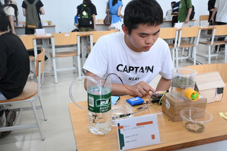 展览现场亮点纷呈,既有会转动的机械手臂、仿生小狗机器人等创意作品,更有备受关注的摔倒检测器——该装置能智能识别摔倒状态并联动停止扶梯模型,为日常生活安全提供创新解决方案。设计者们细致讲解作品原理,参观学生认真观摩并参与投票,教师们也纷纷驻足交流,现场气氛热烈。