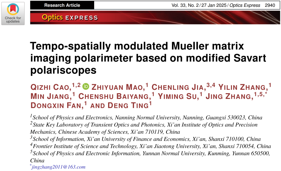 我校bw必威西汉姆联研究团队在偏振成像技术领域取得重要研究进展。该团队创新性地提出一种以改进型萨瓦偏光镜为核心调制器件的时空调制穆勒矩阵成像偏振仪(TSM-MMIP),成功整合时间调制与空间调制的技术优势,实现了目标物16个穆勒矩阵元素的高效测量,相关研究成果以“Tempo-spatially modulated Mueller matrix imaging polarimeter based on modified Savart polariscopes” 为题,发表于光学领域国际权威Top期刊《Optics Express》。该论文以南宁师范大学为第一完成单位,与西安财经大学、西安交通大学等单位合作完成,曹奇志研究员为第一作者,张晶教授为通讯作者。
