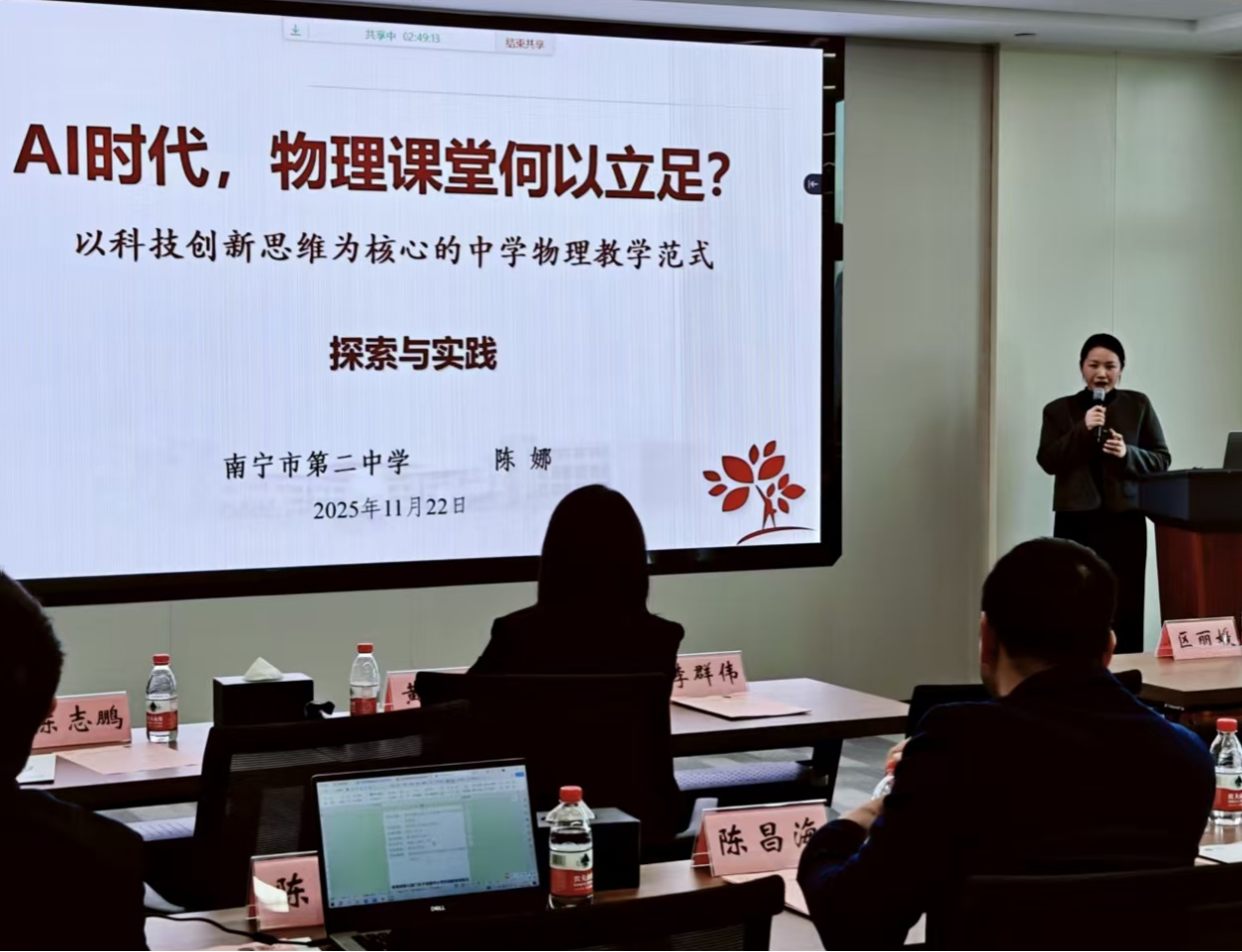 校友南宁二中陈娜老师(物理97级)做了 “AI时代,物理课堂何以立足?——以科技创新思维为核心的物理教学范式探索与实践”主题报告。她的报告围绕人工智能背景下开展学生创新素养培养主线展开,强调学生主体作用,摒弃传统的刷题学习方法,激发学生开拓创新意识。